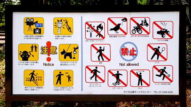 これは、代々木公園にある禁止事項の立札である。数年前に撮影したものだから、今も同じなのかは分からない。この投稿を書くにあたってWebサイトを調べてみたのだが、そこにはこれらの禁止事項に関する言及はなかった。ペットと喫煙に関するマナーの記述だけがあるだけだった。